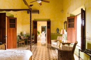 Ese mismo corredor conduce a las amplias recamaras que muestran los elementos principales de diseño regional: doble altura, vigas de madera, altos ventanales, tapetes de pasta, colores intensos y mobiliario rústico de madera.