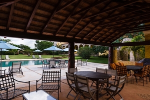 El vestíbulo conecta a un corredor arcado cuyo remate visual son los jardines con estanques y el área de terraza con piscina.